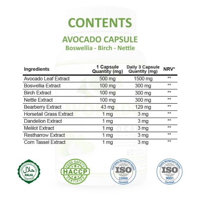Contents : Avocado Leaf Extract, Boswellia Extract, Birch Leaf Extract, Nettle Extract, Capsule: Hydroxypropyl Methyl Cellulose, Rice Starch, Bearberry Extract, Horsetail Grass Extract, Dandelion Extract, Melilot Extract, Rest Harrow Extract, Corn, Anti-clumping: Silisyum Dioxide, Emulsifier: Magnesium Salts of Fatty Acids.