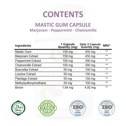 Contents : Mastic Gum, Sweet Marjoram Extract, Peppermint Extract, Capsule: Bovine Gelatin, Matricaria Chamomilla Extract, Rice Starch, Methylsulfonylmethane, Boswellia Extract, Licorice Root Extract, Plantago Extract, Anti-Caking: Magnesium Salts of Fatty Acids, Anti-Clumping: Silicium Dioxide, Thickener: Tragacanth / Tragacum Gamut, Sodium Borate (Boron).