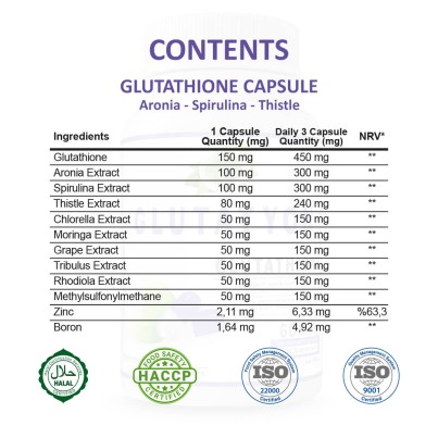 Contents : Glutathione, Aronia Extract, Spirulina Extract, Capsule: Bovine Gelatin, Thistle Extract, Chlorella Extract, Moringa Extract, Grape Extract, Tribulus Extract, Rhodiola Extract, Metilsulfonilmeta, Rice Starch, Thickener: Tragacanth / Tragacum Gamut, Anti-caking: Magnesium Salts of Fatty Acids, Zinc Oxide (Zinc), Sodium Borate (Boron), Anti-Clumping: Silisyum Dioxide.