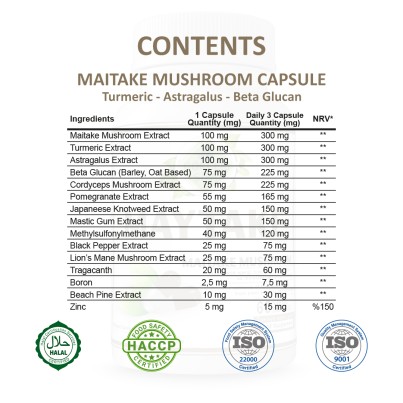 İçindekiler : Maytake Mantarı Ekstresi, Zerdeçal Ekstresi, Geven Ekstresi, Beta Glucan, Kordisep Ekstresi, Japon Madımağı Ekstresi, Nar Meyve Kabuğu Ekstresi, Damla Sakızı Ekstresi, Karabiber, Aslan Yelesi Ekstresi, Çam kabuğu Ekstresi, Çinko oksit, Bor, Silisyum, Kitre, MSM, Maltodekstrin, Pirinç Nişasta, Kapsül: Sığır Jelatin