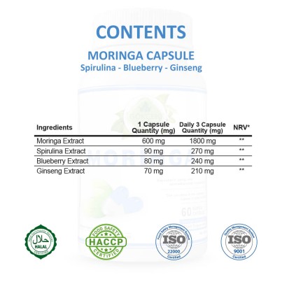 Contents : Moringa Extract, Spirulina Extract, Capsule: Beef Gelatin, Blueberries Extract, Ginsengi Extract, Rice Starch, Anti-Caking: Magnesium Salts Of Fatty Acids, Anti-Caking: Silicium Dioxide.